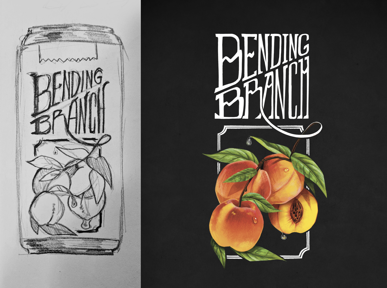 I've always preferred to jot down my ideas on paper before taking the deep dive into creating the final product. Above you can see the original sketchbook sketch of the design, the digital version I made in Procreate, and to the left, the final version brewed by Red Rock Brewery and sold at Harmons.